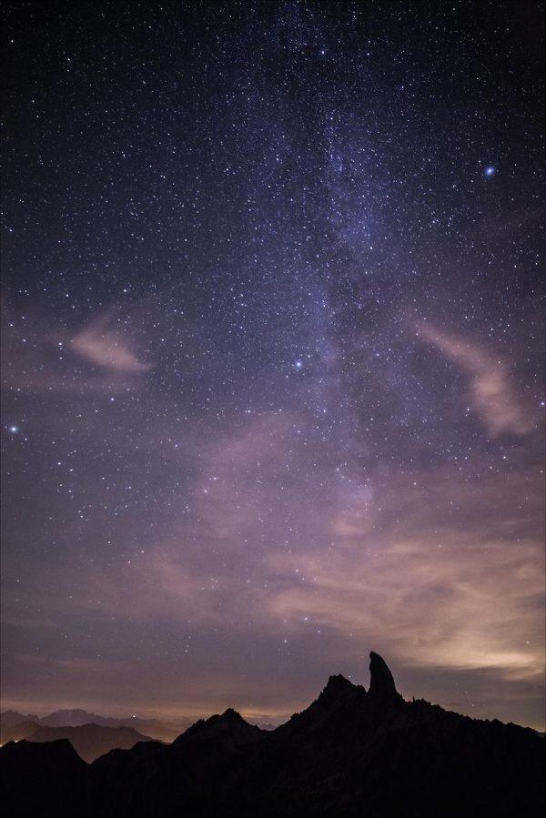 Il y a évidemment une part de chance dans la photo de paysage. Je n’aurais pas pu prévoir que des voiles nuageux viendraient colorer le ciel sans toutefois voler la vedette à la voie lactée. C’est entre autres ces ambiances que je recherche en montagne. Pas de doute, je n’étais pas venu pour rien. Et de toutes façons, même en oubliant mon appareil photo, même dans un brouillard opaque, on ne vient jamais pour rien en montagne. On vient avant tout pour la montagne.
