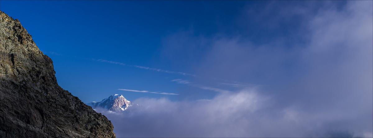 Soudain, alors que je venais de gravir une moraine rendu instable par le retrait glaciaire, l’apparition eu lieu. Dans un coin de ciel bleu encadré de brumes, le Mont Blanc pointait le bout de son nez. Ce n’était pas la photo que j’avais prévu de faire, mais ma journée s’illumina d’un coup.