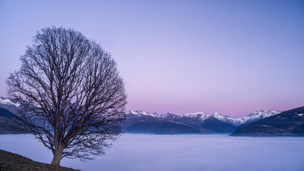 Cela faisait plusieurs jours, voire plusieurs semaines, que le stratus entrait loin dans la vallée de la Tarentaise. Alors que la plupart des villages de la vallée étaient noyés dans le brouillard, même carrément sous le plafond nuageux pour les plus bas, les sommets profitaient d’un beau temps exceptionnel et passaient leurs nuits sous les étoiles. Ce phénomène d’inversion de températures (les températures restent très agréables au-dessus du stratus, alors qu’elles sont hivernales en-dessous) est très courant en hiver, et donnent lieu aux fameuses mers de nuages. Si elles n’arrangent pas le moral des habitants des vallées, ces mers de nuages font le bonheur des photographes, en changeant complétement la vision que l’on a d’un paysage familier.