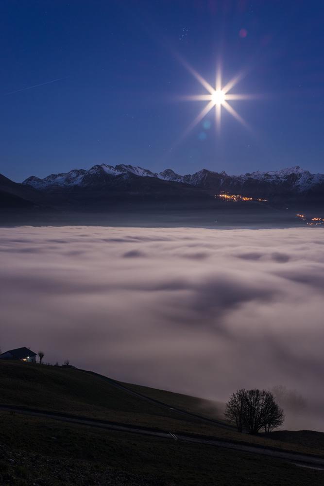« L’étoile du berger » est une photographie que j’ai prise un soir où une mer de nuages persistante depuis plusieurs jours m’avait poussé à prendre de l’altitude. Après avoir retrouvé le ciel bleu, j’ai pu profiter du coucher de soleil sur les sommets déjà blanchis des premières neiges de l’automne, avant que la nuit ne tombe et que la lune ne vienne éclairer cette marée montante.