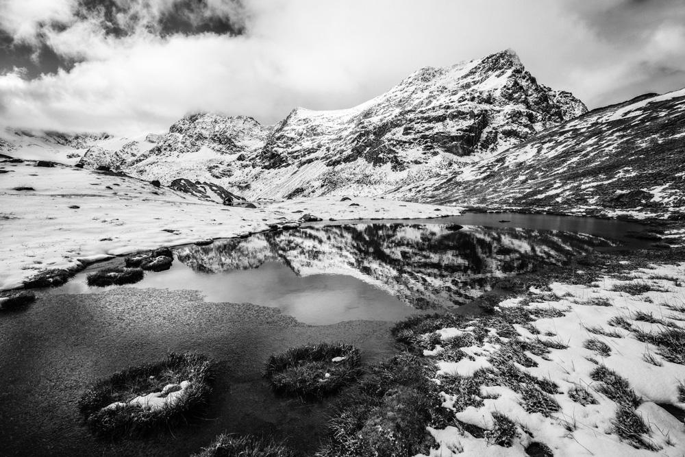 La vague tentative de la montagne de se mirer dans le petit lac tourna court, lorsqu’une brise légère en troubla la surface. Tout près de ce reflet trouble, quelques flocons de neige avaient profité d’une végétation propice pour faire leur nid à l’abri de la bise.