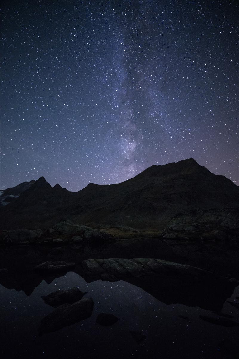 Nous étions partis quelques jours en Haute-Maurienne pour changer un peu d’air. Nous avions envie de revoir des coins qu’on aimait et en découvrir de nouveaux. J’avais surtout envie de rendre visite à un glacier lacustre que j’aime beaucoup, et surtout de le voir au lever du jour, voire même sous les étoiles. En attendant que vienne l’heure de la randonnée matinale, les petits lacs près du refuge se remplirent de reflets. La nuit était enfin tombée, la voie lactée s’était levée. Le lac aux étoiles nous apparu avec toutes ses paillettes.