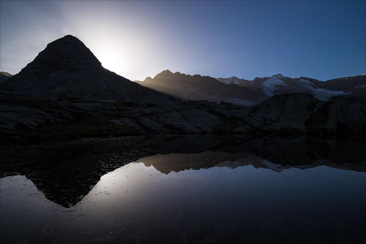 Nous étions partis quelques jours en Haute-Maurienne pour changer un peu d’air. Nous avions envie de revoir des coins qu’on aimait et en découvrir de nouveaux. J’avais surtout envie de rendre visite à un glacier lacustre que j’aime beaucoup, et surtout de le voir au lever du jour, voire même sous les étoiles. L’heure bleue nous surpris en pleine ascension. Malheureusement ma compagne, pas très à l’aise, avait préféré rentrer au refuge. Pas grave, ce n’était que partie remise. En attendant le lever du soleil nous réjouissait au bord des petits lacs des Pareis. Le gros prisme noir du Mont Seti s’amusait avec les rayons du soleil.