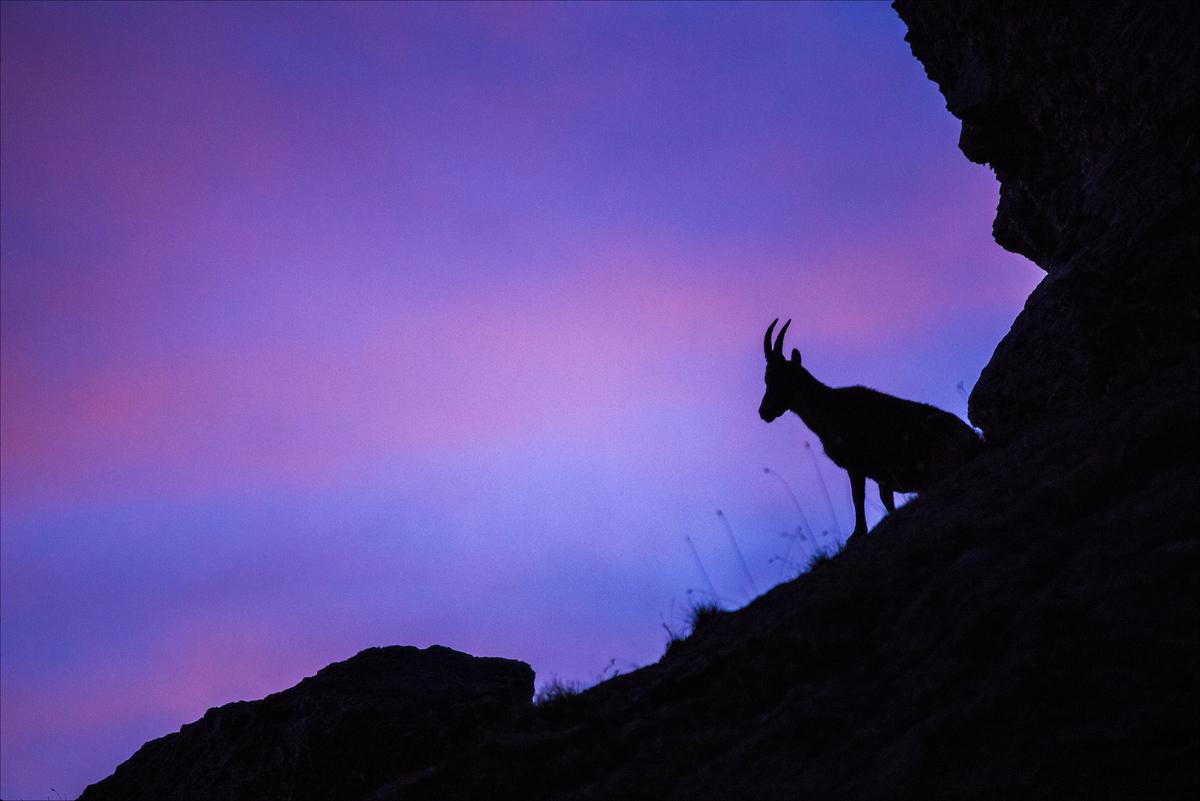 Outre le paysage époustouflant autour de ce refuge, je m’étais régalé avec une scène curieuse lors de ce premier séjour. Un groupe de bouquetins s’était réuni sur un gros rocher, et ils semblaient lécher la roche. Je découvris le lendemain que le gardien avait déposé une pierre à sel pour les attirer près du refuge. Cela me faisait donc une excellente raison de charger mon sac à dos d’un kilo de plus, pour profiter de mon 300mm. Je ne fus pas déçu puisqu’un visiteur du soir vint prendre la pose. Ou plutôt une visiteuse, puisqu’il s’agit ici d’une étagne, femelle du bouquetin.
