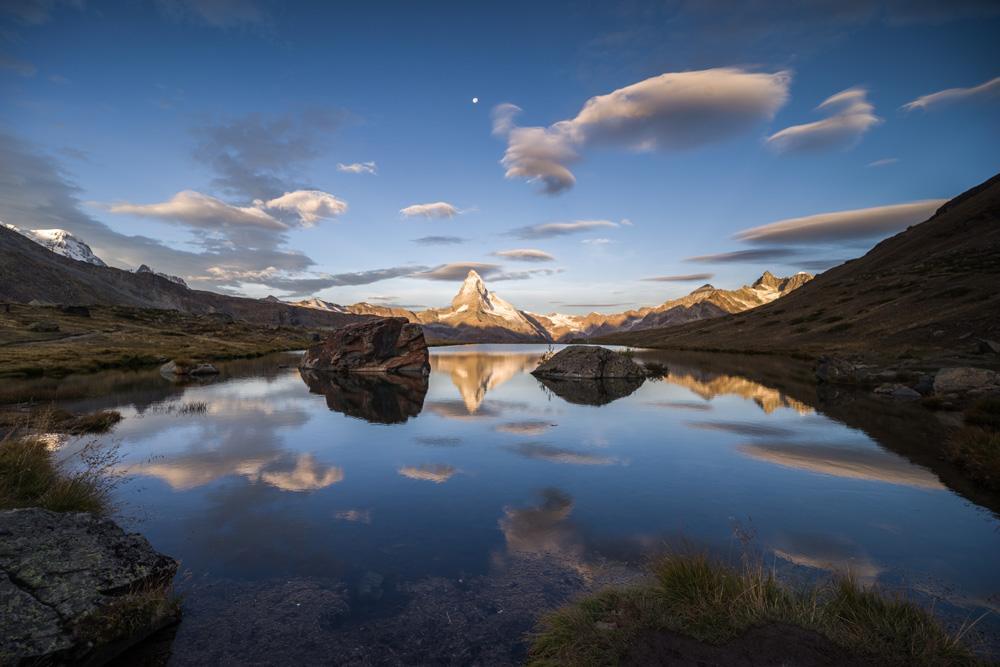 Il est des lieux qui, même sans les réseaux sociaux, attirent les photographes. La difficulté étant d’y éviter la foule (et aussi d’y faire des photos originales, mais ça commence à devenir compliqué étant donné qu’on est tous devenus photographes). Et le meilleur moyen d’éviter la foule en montagne, c’est de s’y rendre tôt le matin ou tard le soir. Ça tombe bien, c’est aussi dans ces moments-là que la lumière est la plus agréable au photographe. Désolé de vous infliger à mon tour une série de photos du Cervin se reflétant dans le Stellisee.