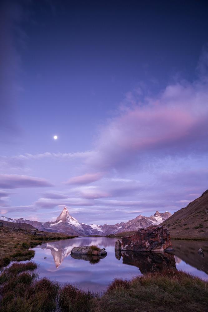 Il est des lieux qui, même sans les réseaux sociaux, attirent les photographes. La difficulté étant d’y éviter la foule (et aussi d’y faire des photos originales, mais ça commence à devenir compliqué étant donné qu’on est tous devenus photographes). Et le meilleur moyen d’éviter la foule en montagne, c’est de s’y rendre tôt le matin ou tard le soir. Ça tombe bien, c’est aussi dans ces moments-là que la lumière est la plus agréable au photographe. Désolé de vous infliger à mon tour une série de photos du Cervin se reflétant dans le Stellisee.