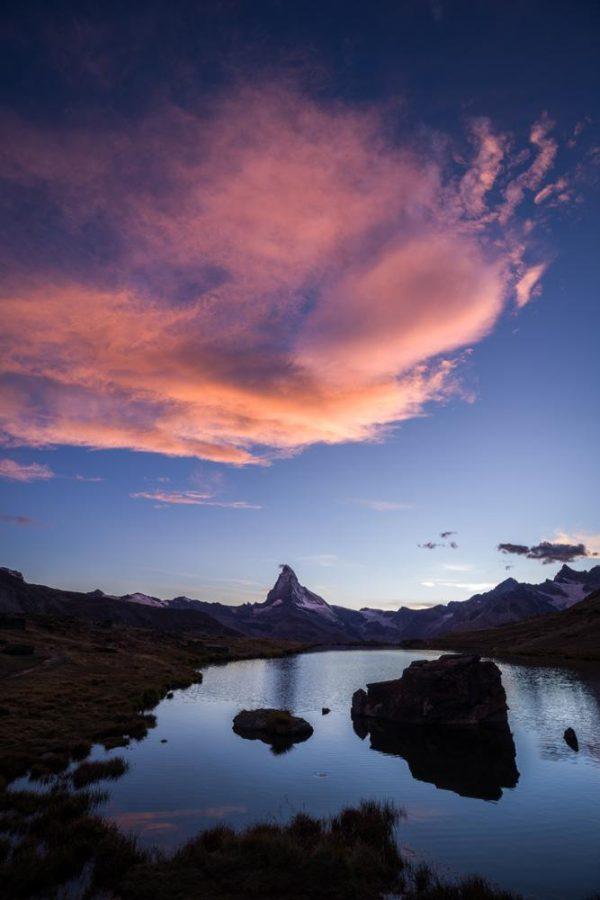 Il est des lieux qui, même sans les réseaux sociaux, attirent les photographes. La difficulté étant d’y éviter la foule (et aussi d’y faire des photos originales, mais ça commence à devenir compliqué étant donné qu’on est tous devenus photographes). Et le meilleur moyen d’éviter la foule en montagne, c’est de s’y rendre tôt le matin ou tard le soir. Ça tombe bien, c’est aussi dans ces moments-là que la lumière est la plus agréable au photographe. Désolé de vous infliger à mon tour une série de photos du Cervin se reflétant dans le Stellisee.