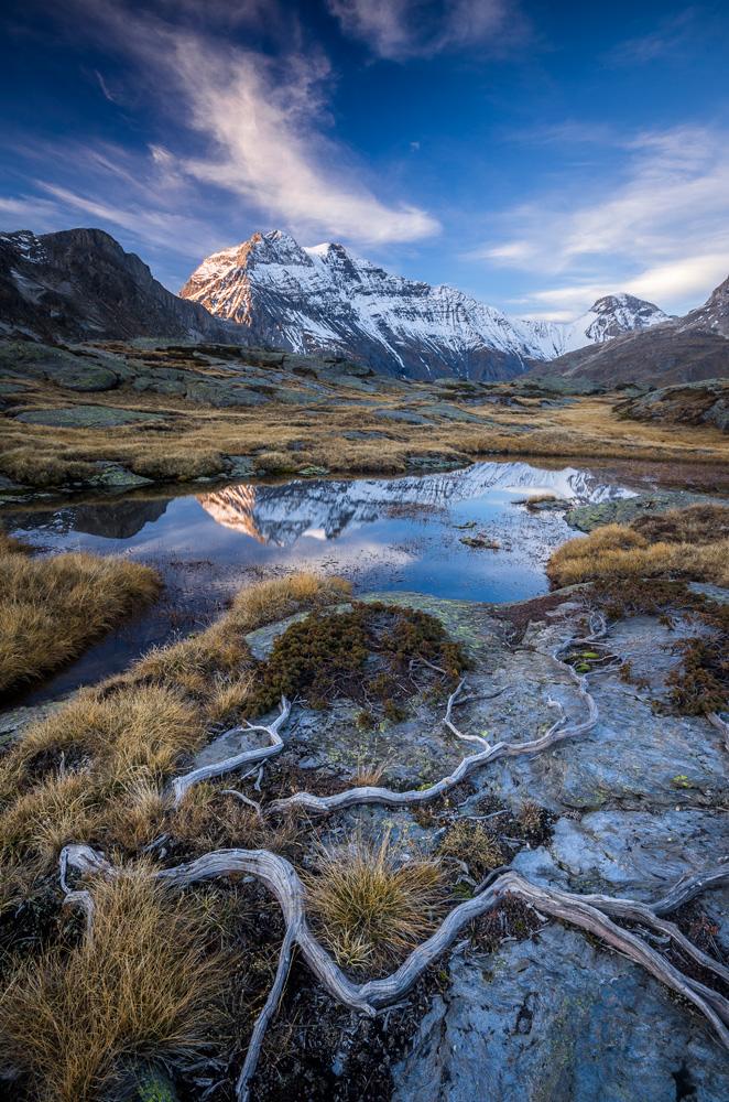 Il n’est pas exagéré de dire que j’avais été gâté pour mon premier séjour dans ce site exceptionnel. Le coucher de soleil s’annonçait fort sympathique, et les premiers plans ne manquaient pas pour agrémenter le décor grandiose que formait la face sud de la Grande Casse. Ce soir-là j’ai été plutôt bien inspiré d’ajouter au reflet de la montagne dans un petit lac, un entrelacs de racines de genévriers :